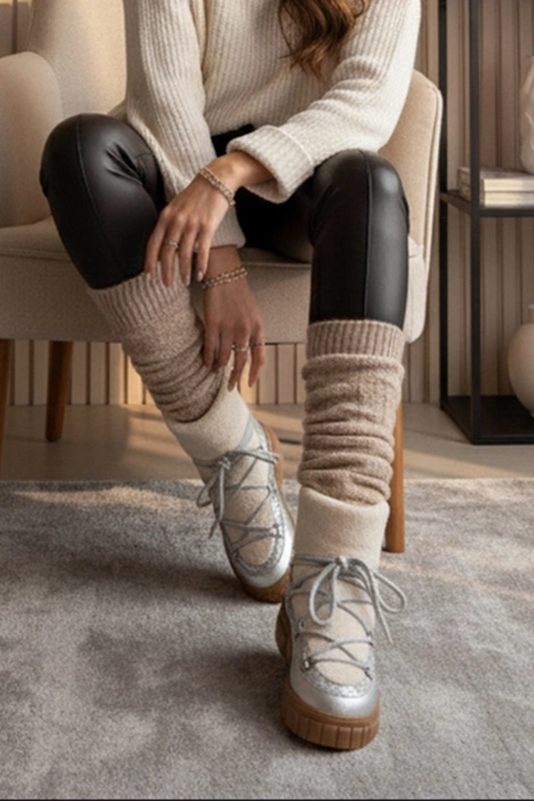 - Ζεστά γυναικεία παπούτσια από αδιάβροχο ύφασμα, διακοσμημένα με αφράτο οικολογικό τρίχωμα σε ασημί σχέδιο.