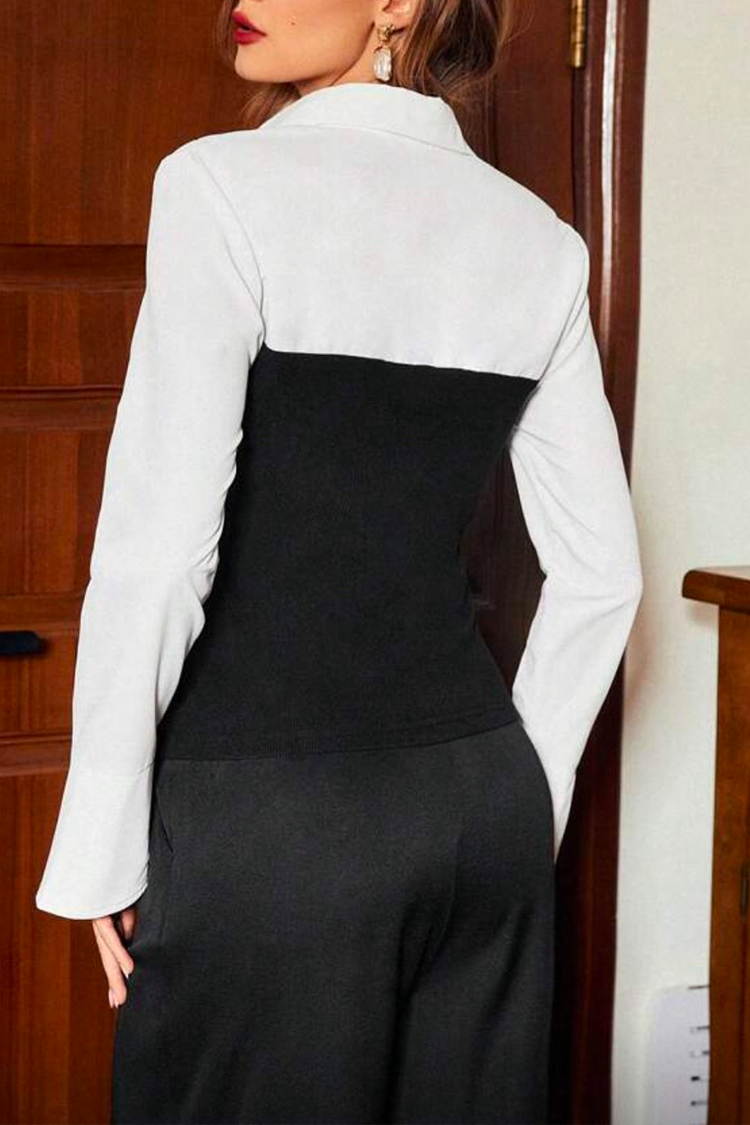 - Το μοντέλο έχει γιακά, κλασική και κομψή γραμμή και ασπρόμαυρο σχέδιο.