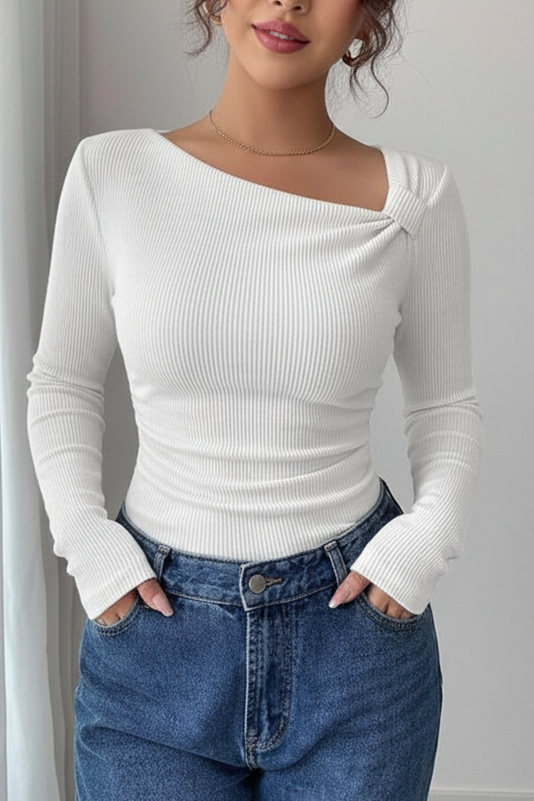 - Το μοντέλο έχει μακριά μανίκια, εφαρμοστή γραμμή, μονόχρωμο μοτίβο και ασύμμετρη λαιμόκοψη.