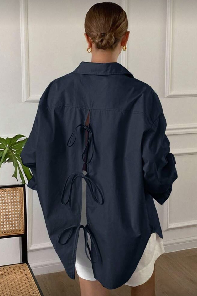 - Το μοντέλο έχει μακριά μανίκια, oversize γραμμή, κουμπώνει με κουμπιά μπροστά και έχει εντυπωσιακή πλάτη με διακοσμητικές κορδέλες.
