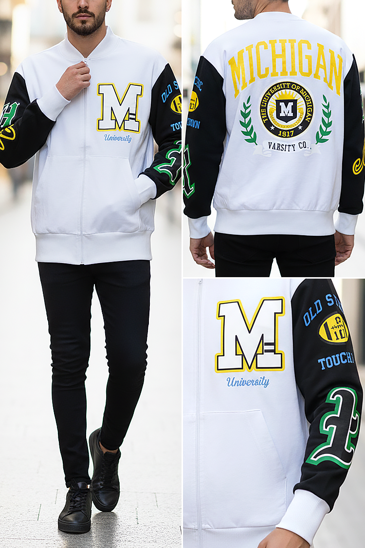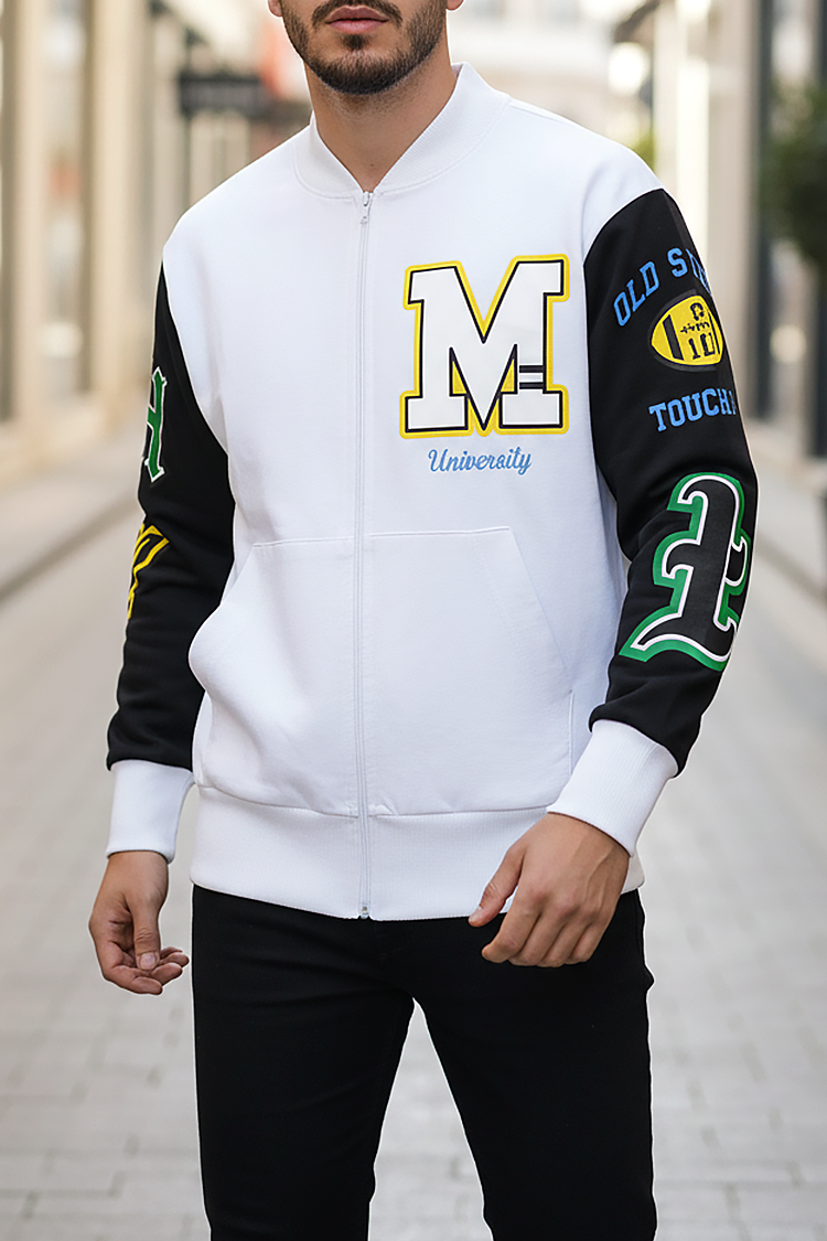 - Μοντέρνο ανδρικό φούτερ με τσέπες σε λευκό χρώμα και εντυπωσιακό μοτίβο στα μανίκια και στην πλάτη, κατάλληλο για καθημερινή χρήση, αθλητισμό ή βόλτα.