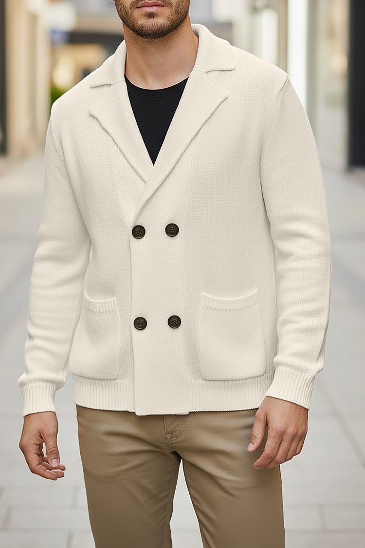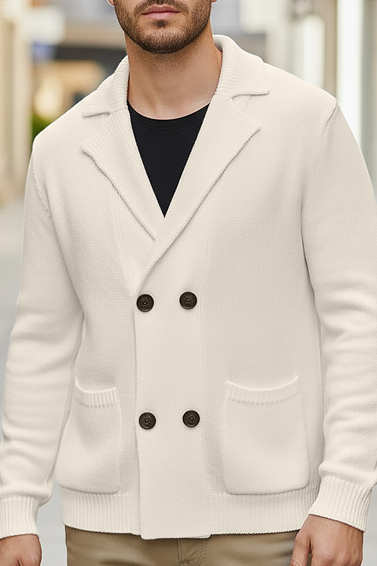 - Κομψή ανδρική ζακέτα με γιακά και διπλό κούμπωμα σε κλασικό εκρού χρώμα, κατάλληλη για διάφορους συνδυασμούς μόδας.