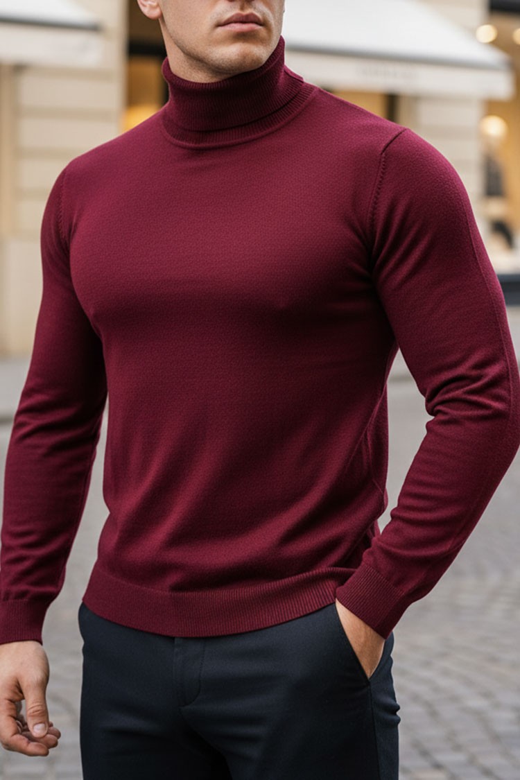 - Κομψό ανδρικό πουλόβερ με ζιβάγκο και εφαρμοστή γραμμή σε χρώμα μπορντό.