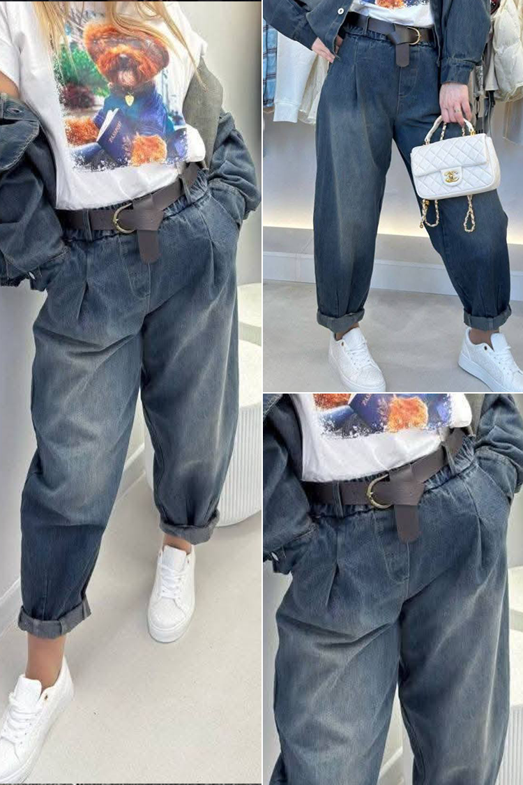 - Το μοντέλο έχει ελαστική μέση, φαρδιά μπατζάκια και ζώνη από οικολογικό δέρμα.