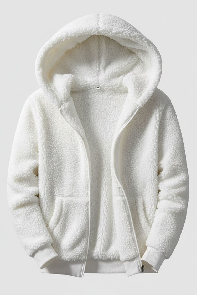 - Ανδρικό φούτερ φλις με ελαστικές μανσέτες, τσέπες και κουκούλα σε κλασικό λευκό χρώμα.