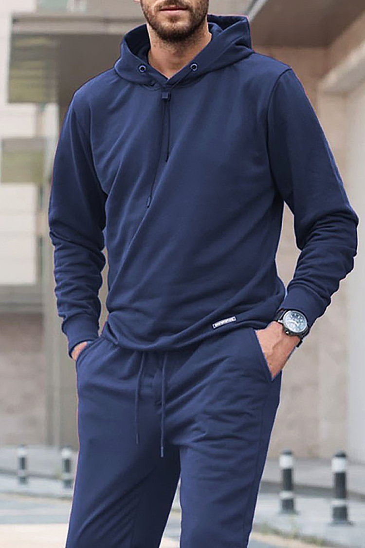 - Ανδρικό αθλητικό σετ δύο τεμαχίων, που αποτελείται από φούτερ με κουκούλα και παντελόνι σε σκούρο μπλε χρώμα.