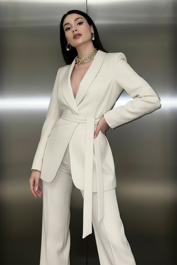 - Το σακάκι έχει κουμπί μπροστά και ζώνη από ύφασμα στο ίδιο χρώμα.