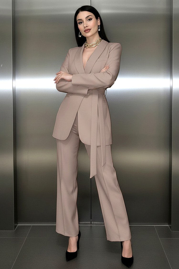- Το σακάκι έχει κουμπί μπροστά και ζώνη από ύφασμα στο ίδιο χρώμα.