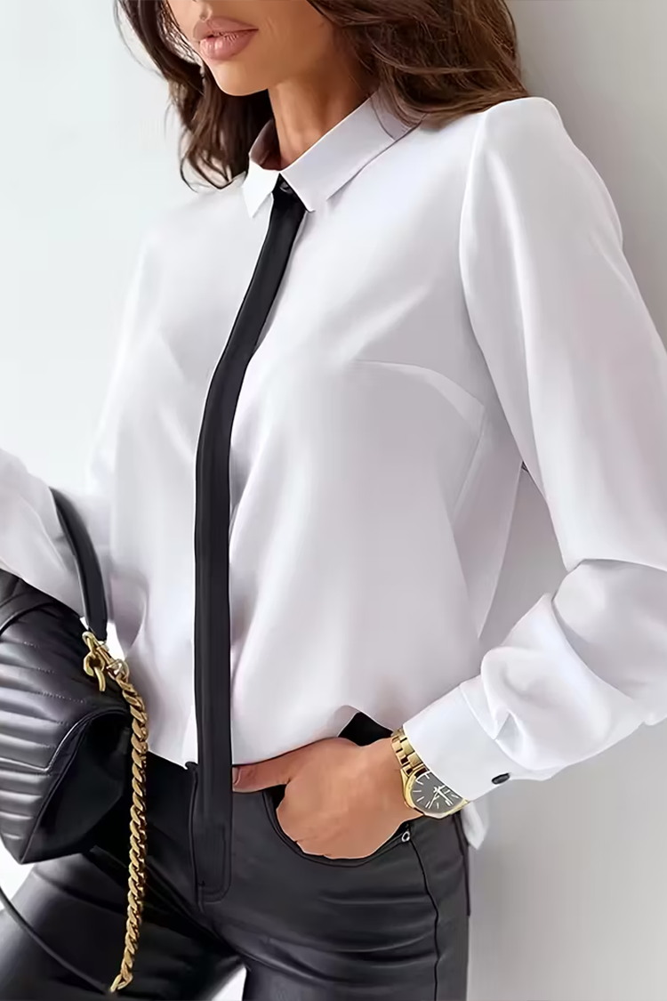 - Το μοντέλο έχει κλασική γραμμή και αντίθεση με μαύρο γραβάτα, η οποία μπορεί να αφαιρεθεί για πιο κλασική εμφάνιση.