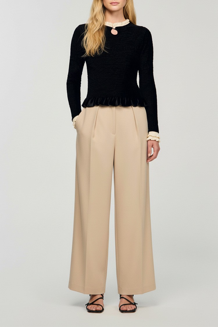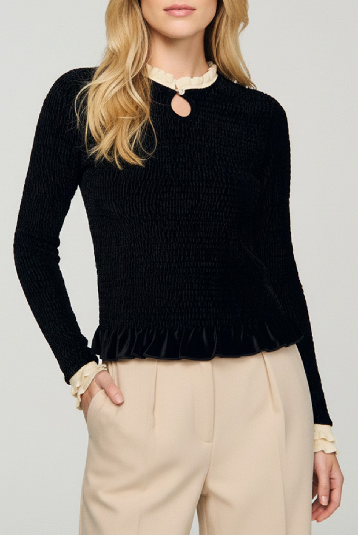 - Κομψή γυναικεία μπλούζα, που συνδυάζει το κλασικό μαύρο χρώμα με απαλές μπεζ πινελιές.