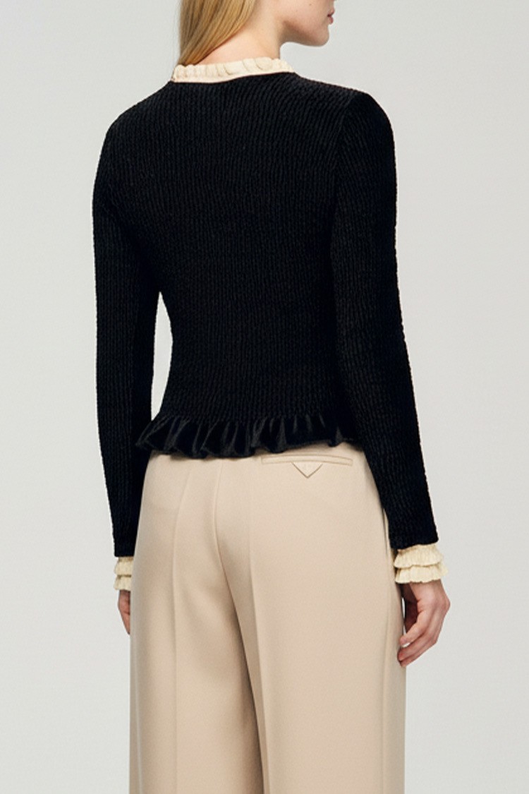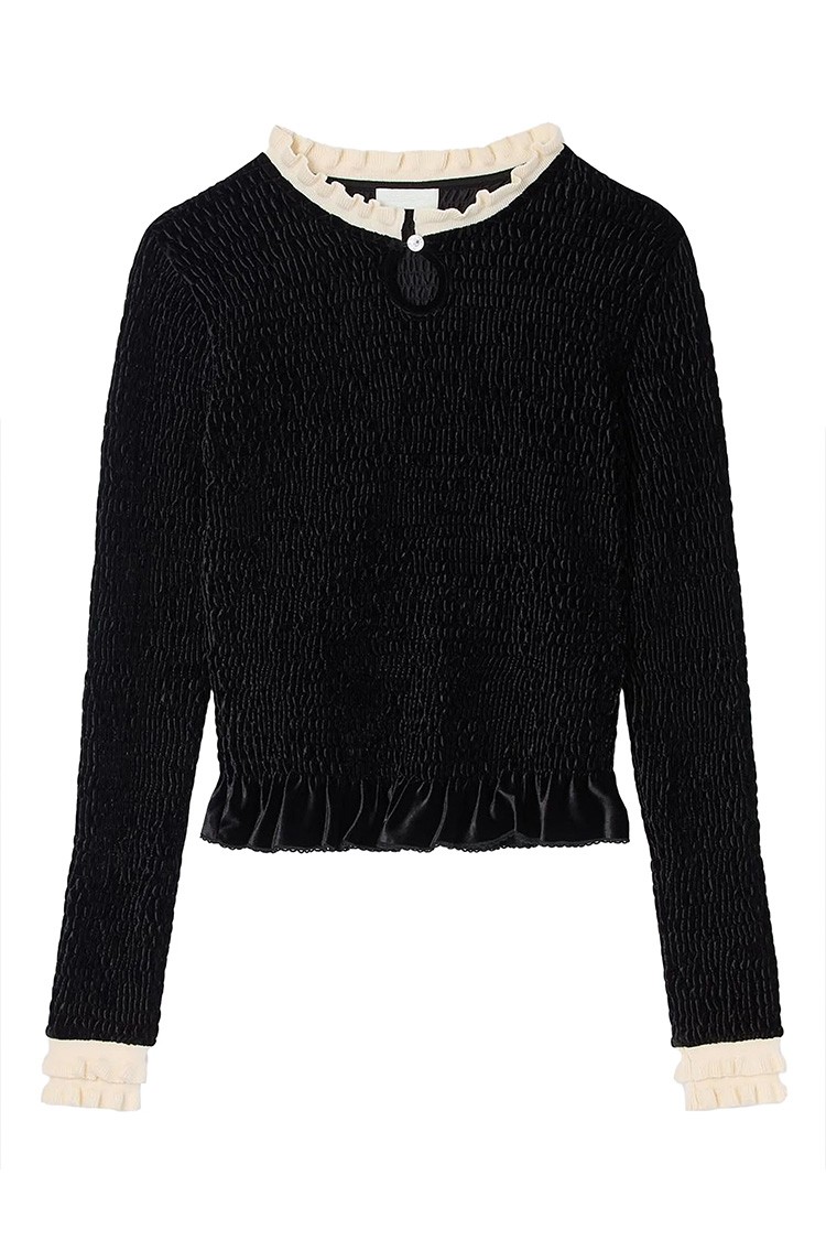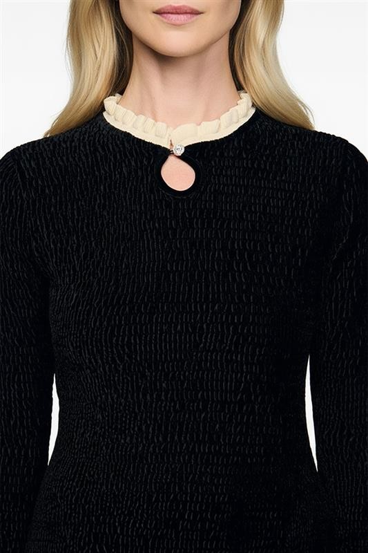 - Το μοντέλο διακρίνεται για το λεπτό ανάγλυφο του υφάσματος, τη διακοσμητική τρύπα στο ντεκολτέ και τα κομψά βολάν στο γιακά.