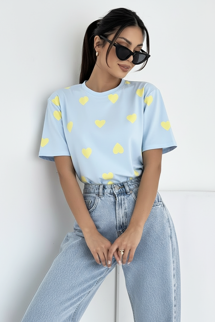 - Το μοντέλο έχει κοντά μανίκια, στρόγγυλη λαιμόκοψη, προσεγμένη γραμμή και μοτίβο καρδιές.