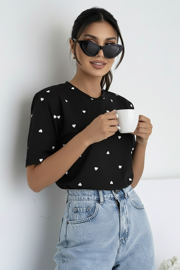- Το μοντέλο έχει κοντά μανίκια, στρόγγυλη λαιμόκοψη, προσεγμένη γραμμή και μοτίβο καρδιές.