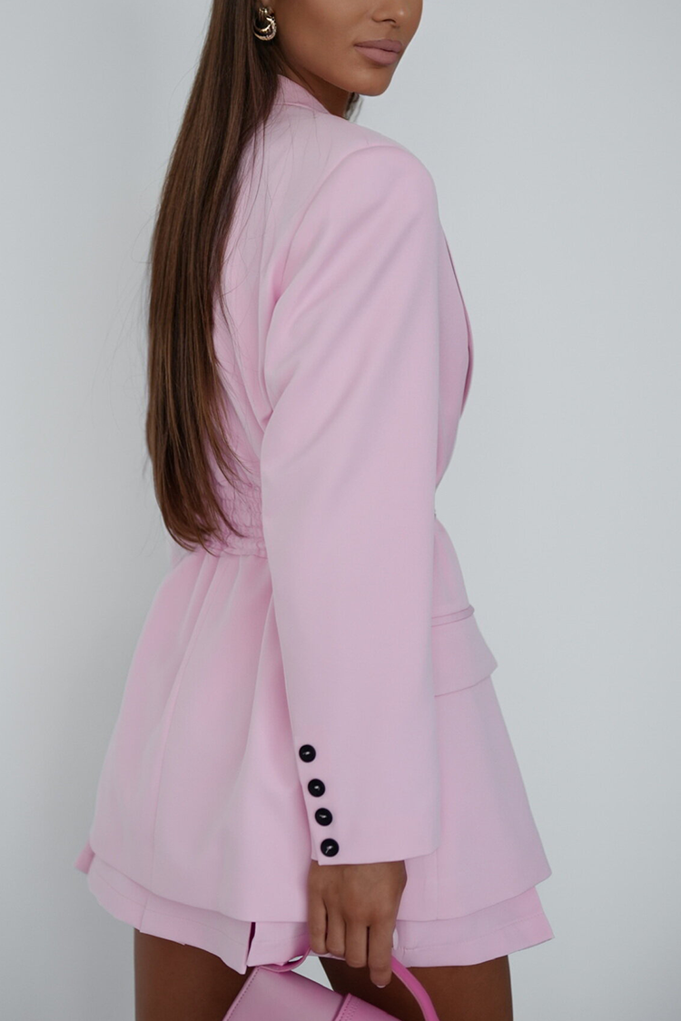 - Το σακάκι έχει κλασική γραμμή, γιακά, κουμπιά, πλαϊνές τσέπες και ζώνη από το ίδιο ύφασμα.