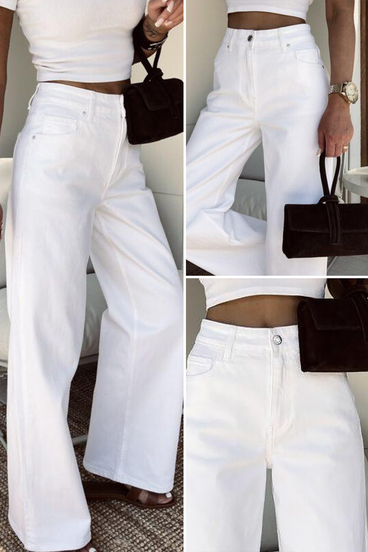 - Το μοντέλο έχει ψηλή μέση, φαρδιά μπατζάκια, πλαϊνές τσέπες και λευκό χρώμα.