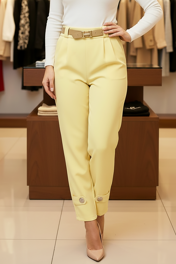 - Το μοντέλο έχει ψηλή μέση, κομψή γραμμή, τσέπες, ζώνη από οικολογικό δέρμα και κουμπιά στα μπατζάκια.