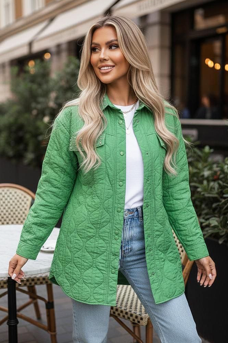 - Το μοντέλο έχει καπιτονέ σχέδιο, γιακά, τσέπες και εντυπωσιακά κουμπιά.