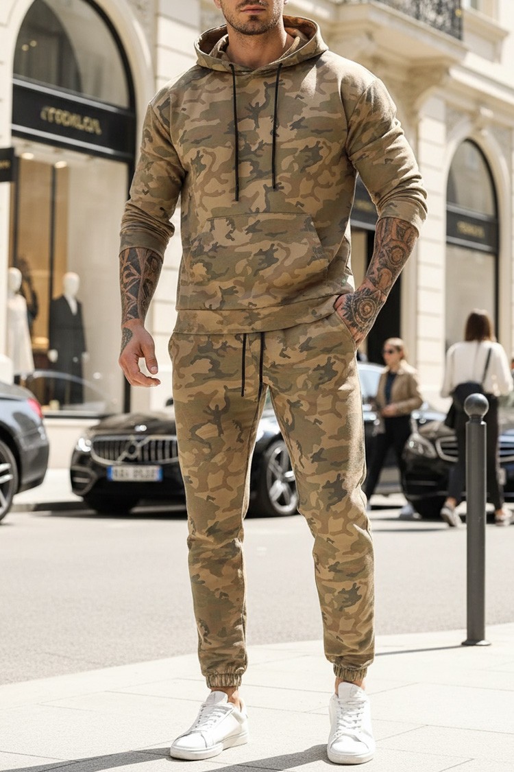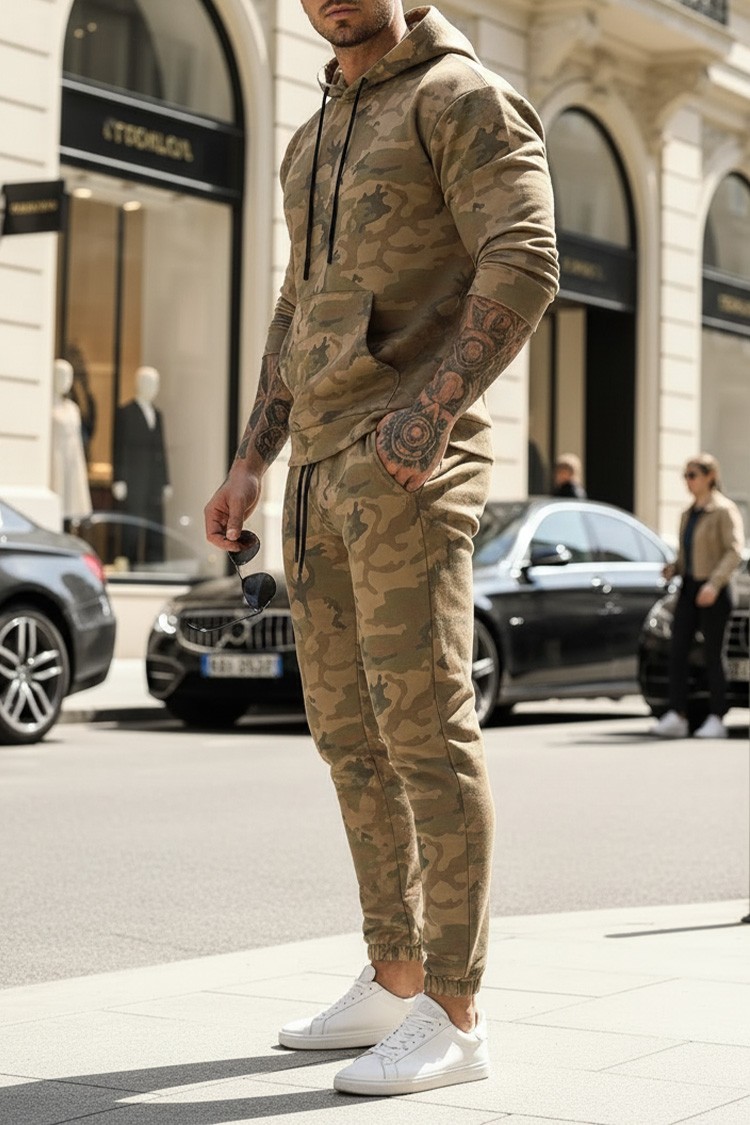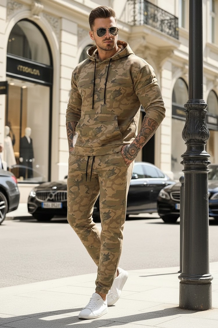 - Άνετο ανδρικό σετ δύο τεμαχίων με καμουφλάζ σχέδιο, που αποτελείται από φούτερ και παντελόνι.