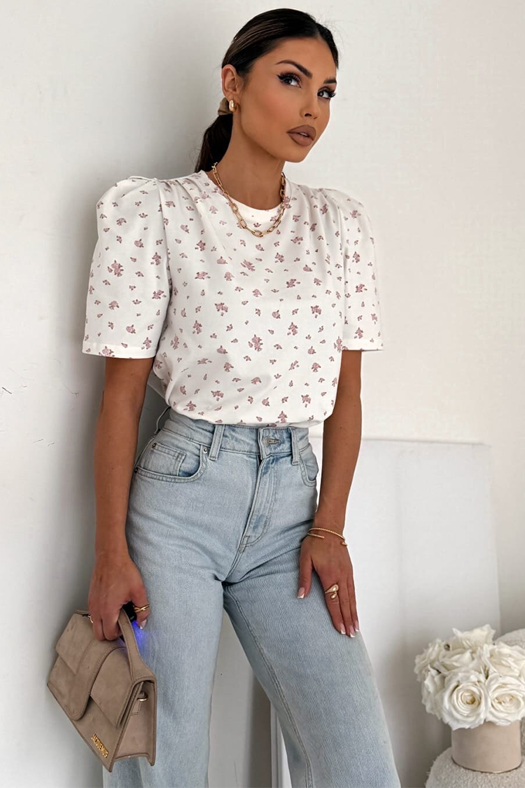 - Το μοντέλο έχει κοντά και κοκέτα μανίκια, στρόγγυλη λαιμόκοψη, προσεγμένη γραμμή και floral σχέδιο.