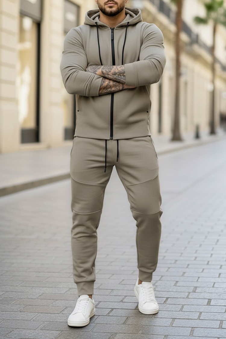 - Πρακτικό ανδρικό σετ δύο τεμαχίων, που αποτελείται από φούτερ με κουκούλα και παντελόνι σε μαύρο χρώμα.