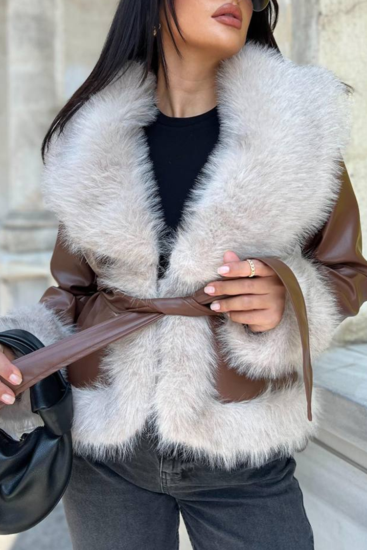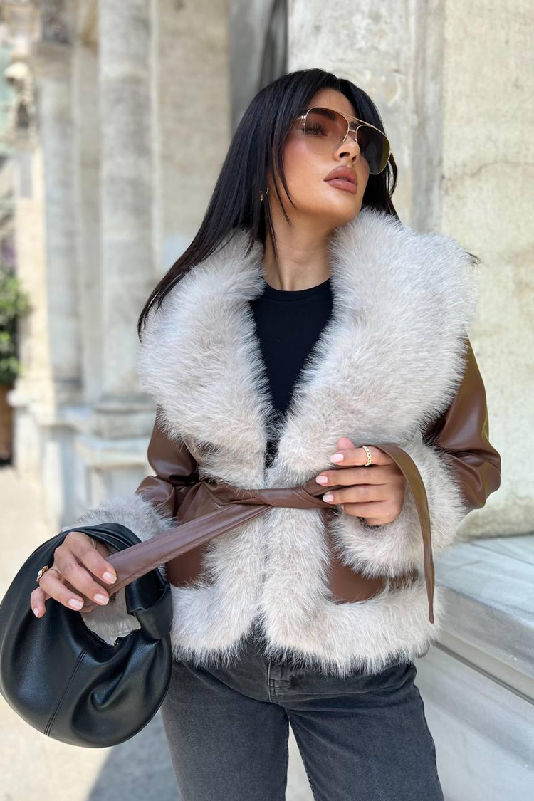- Το μοντέλο είναι από οικολογικό δέρμα, με μεγάλη γιακά με γούνα, ανοιχτό καφέ χρώμα και ζώνη από το ίδιο ύφασμα.