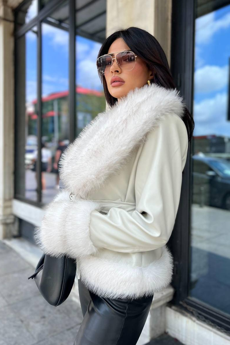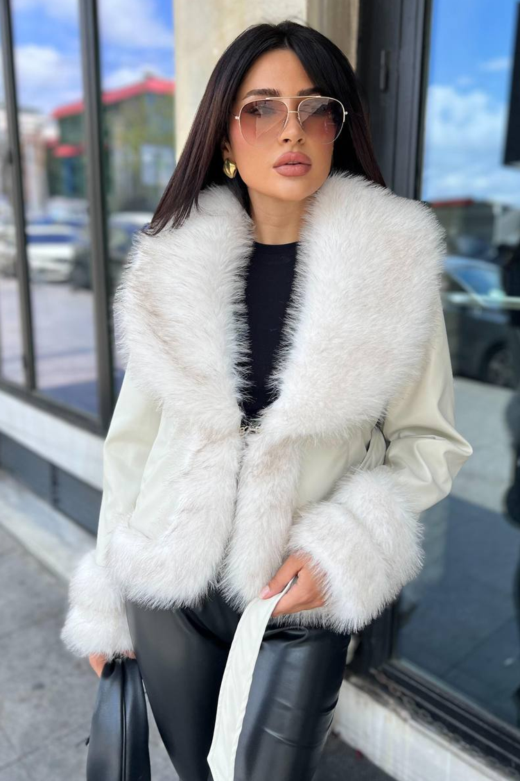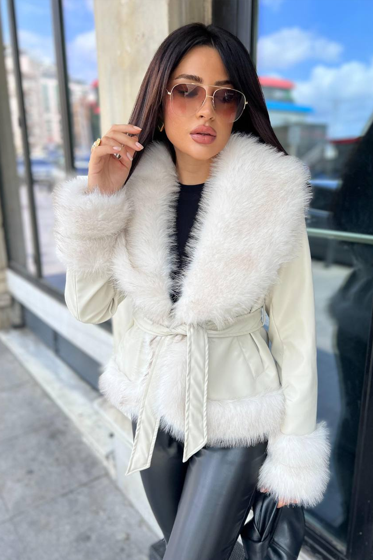 - Το μοντέλο είναι από οικολογικό δέρμα, με μεγάλη γιακά με γούνα, ανοιχτό καφέ χρώμα και ζώνη από το ίδιο ύφασμα.