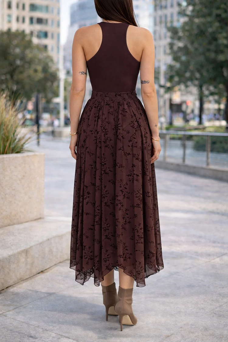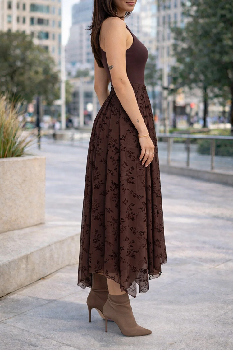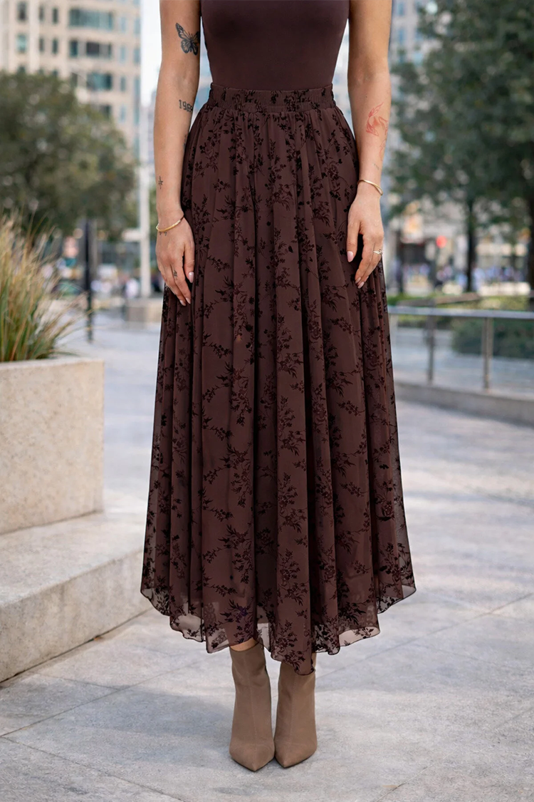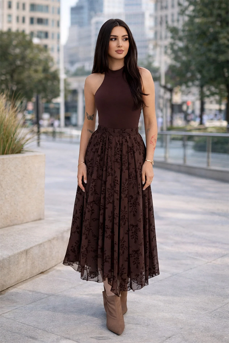 - Μοντέρνα φούστα σε καφέ χρώμα, κατάλληλη για διάφορες καθημεριές εμφανίσεις.