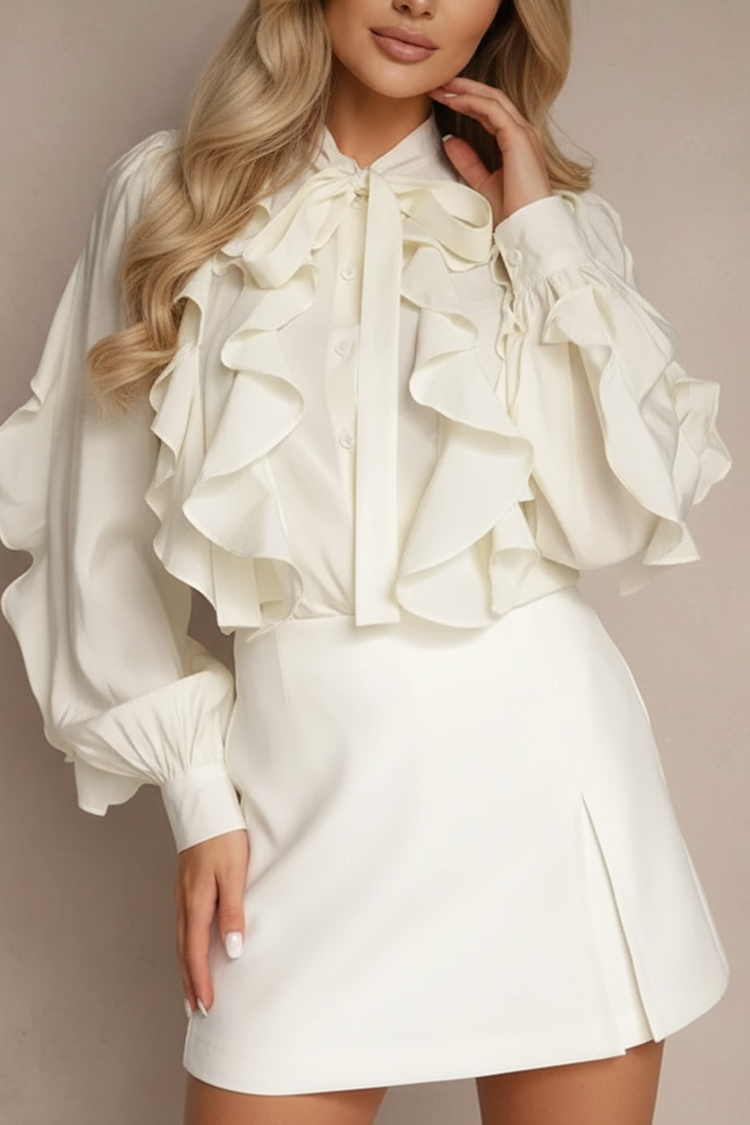 - Το μοντέλο έχει κουμπιά σε όλο το μήκος, κομψό σχεδιασμό και εντυπωσιακά βολάν.