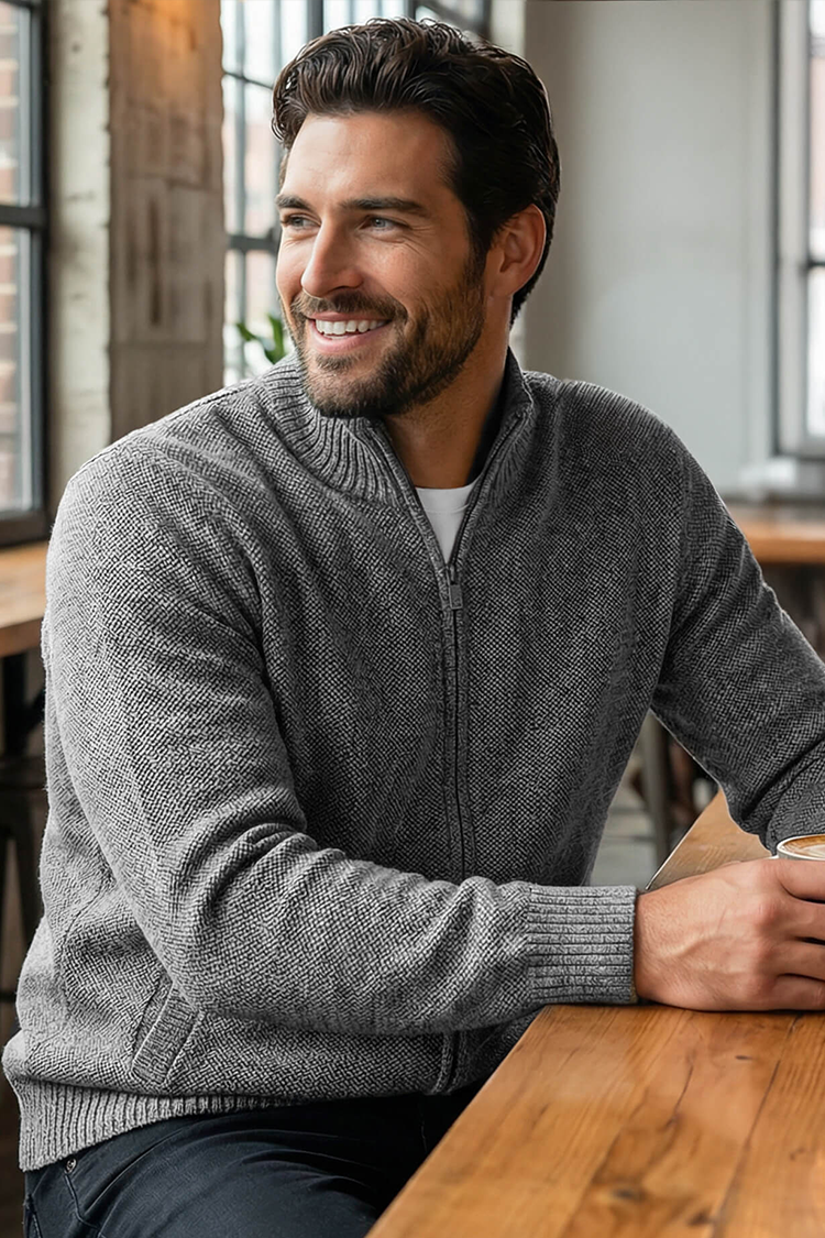 - Κλασικό μοντέλο ανδρική ζακέτα με ψηλό γιακά και τσέπες σε χρώμα γραφίτη, κατάλληλη για καθημερινή χρήση.
