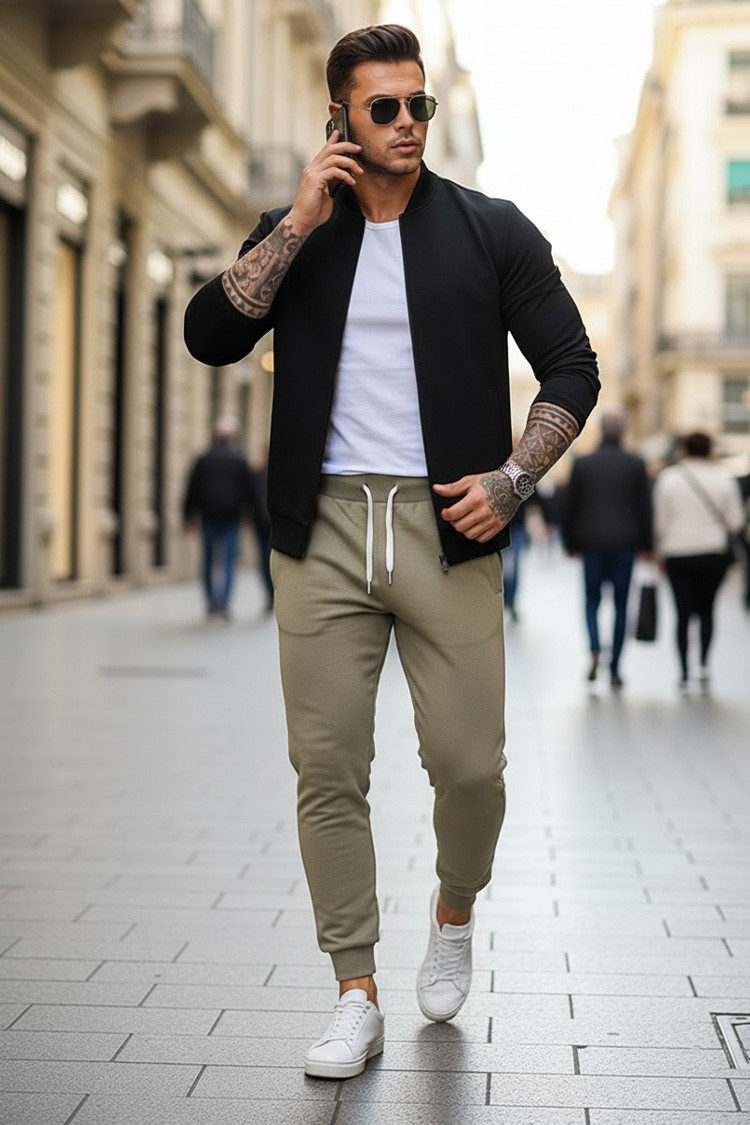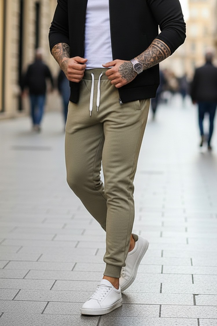 - Ανδρικό αθλητικό παντελόνι με λιτό σχεδιασμό σε χακί χρώμα, κατασκευασμένο από βαμβακερό ύφασμα.