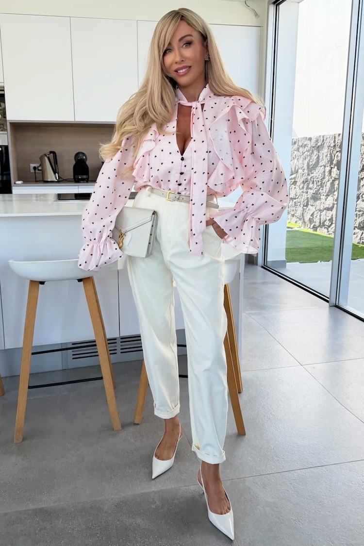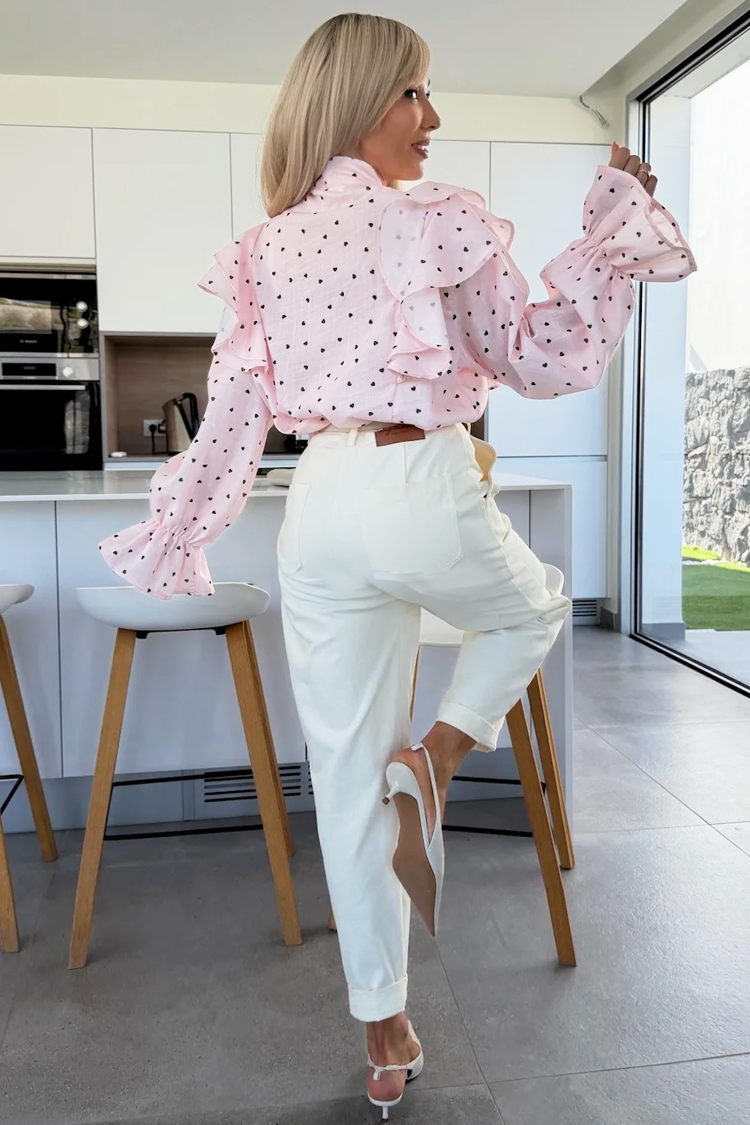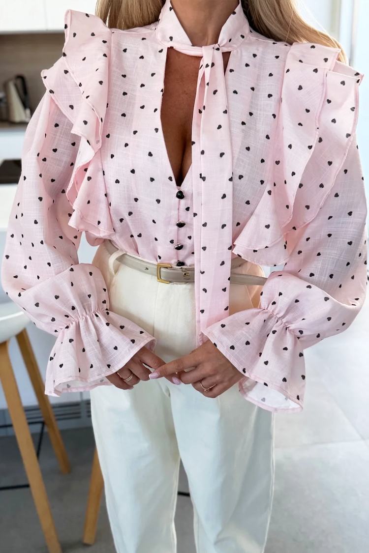 - Το μοντέλο έχει κουμπιά σε όλο το μήκος, κομψό σχεδιασμό και εντυπωσιακά βολάν και σχέδιο με καρδιές.