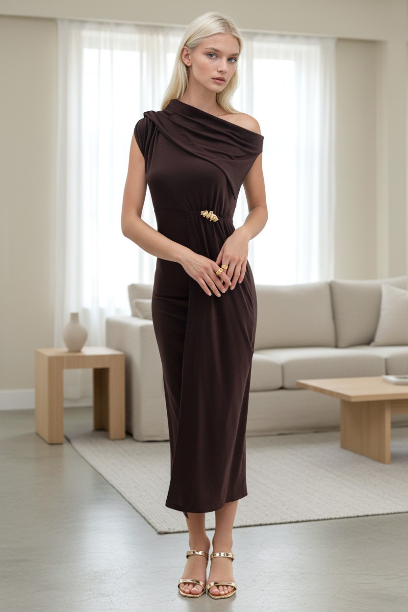 - Το μοντέλο έχει κομψή γραμμή, μεταλλικό στοιχείο μπροστά, σκίσιμο και ασύμμετρη λαιμόκοψη.