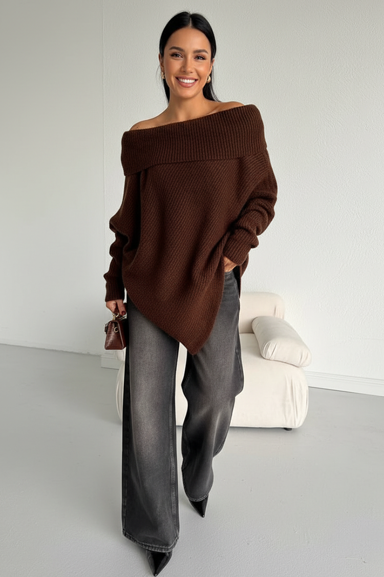 - Το μοντέλο έχει oversize γραμμή, ασύμμετρο σχέδιο και ανοιχτούς ώμους.