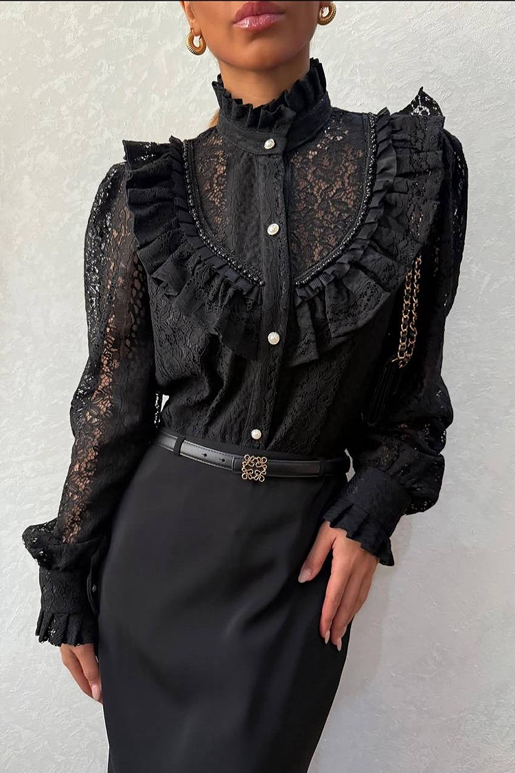 - Το μοντέλο έχει κουμπιά σε όλο το μήκος, κομψό σχεδιασμό και εντυπωσιακά βολάν, δαντέλα και διακοσμητικές πέρλες.