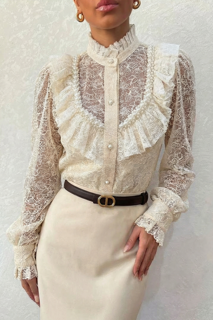 - Το μοντέλο έχει κουμπιά σε όλο το μήκος, κομψό σχεδιασμό και εντυπωσιακά βολάν, δαντέλα και διακοσμητικές πέρλες.