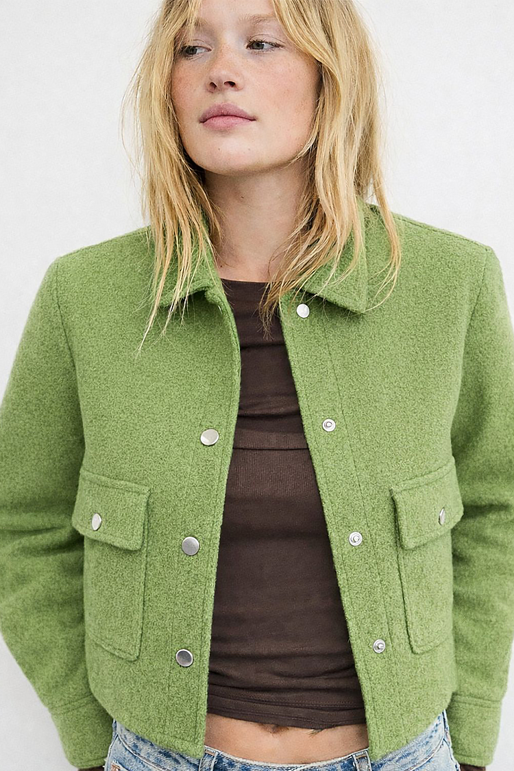 - Το μοντέλο έχει μονόχρωμο μοτίβο, πλαϊνές τσέπες, γιακά και crop σχεδιασμό.