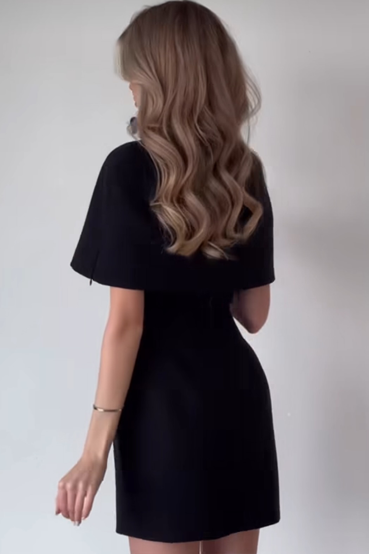 - Το μπολερό έχει κομψό σχεδιασμό, ενώ το φόρεμα έχει άνετες τιράντες και κοντό μήκος. Κλείνει με φερμουάρ στην πλάτη.