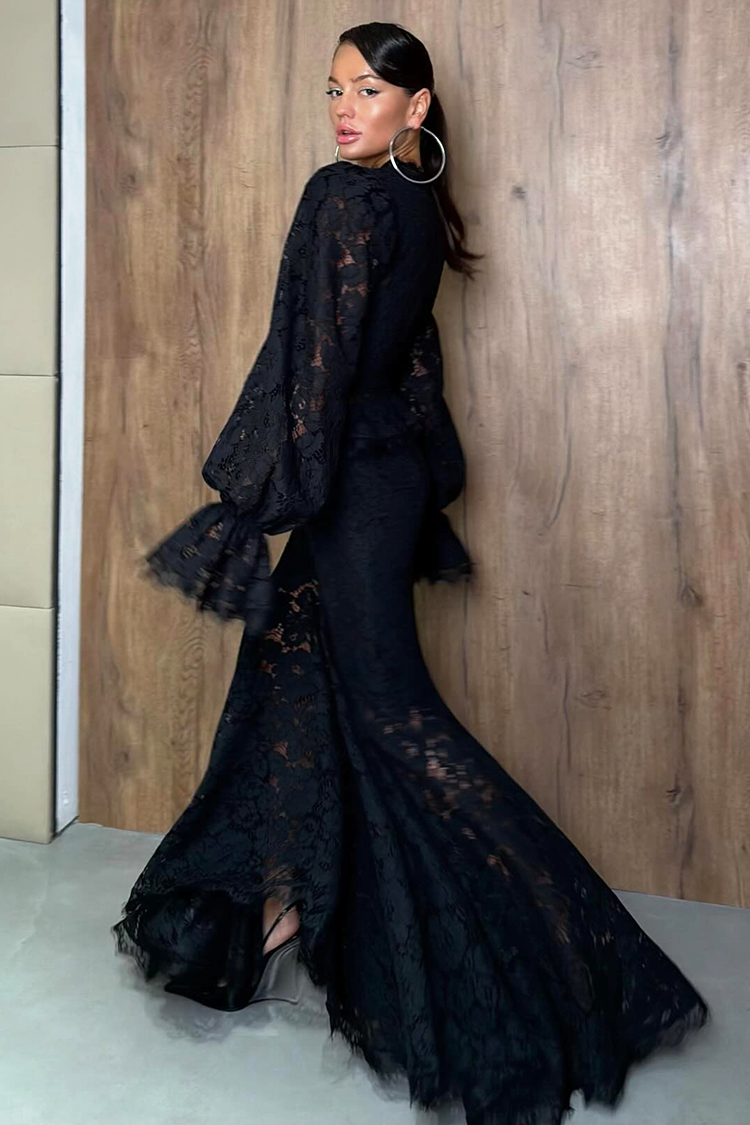 - Το πουκάμισο έχει μακριά, εντυπωσιακά μανίκια και κομψά κουμπιά στην λαιμόκοψη. Η φούστα έχει ψηλή μέση και είναι μακριά.
