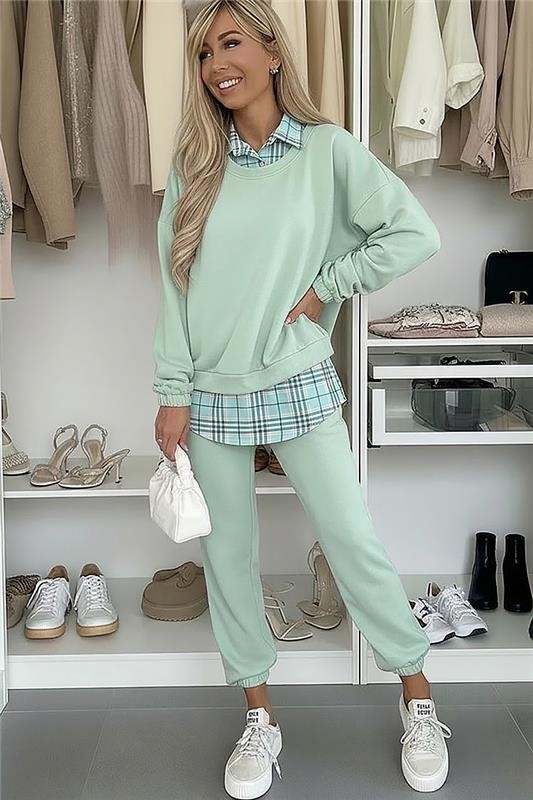- Το μοντέλο έχει ύψος 170 cm και ποζάρει με ένα μέγεθος.Σετ δύο τεμαχίων - μπλούζα και παντελόνι σε μοντέρνα χρώματα.