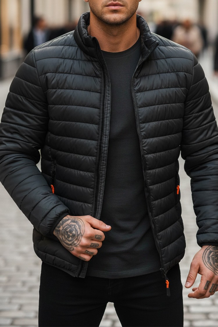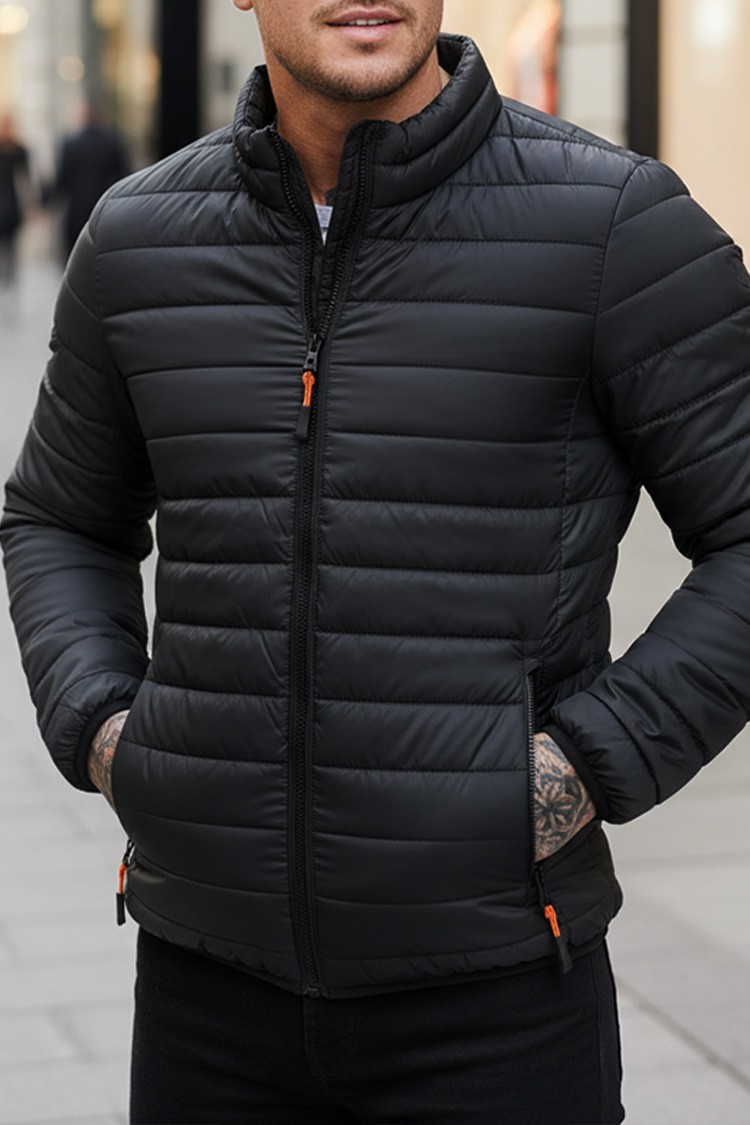 - Καπιτονέ ανδρικό μπουφάν με λιτό σχέδιο σε μαύρο χρώμα, κατάλληλο για τις μεταβατικές εποχές.