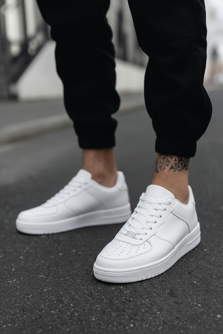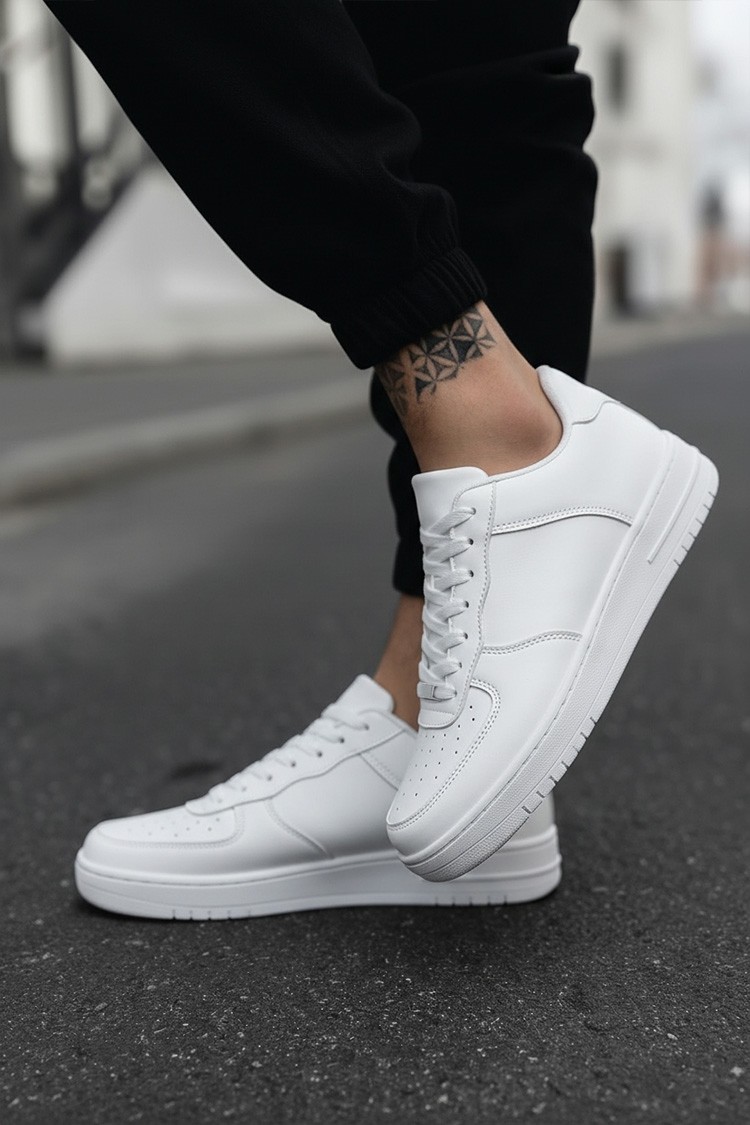- Μοντέρνα ανδρικά πάνινα παπούτσια σε λευκό χρώμα, κατασκευασμένα από οικολογικό δέρμα, κατάλληλα για καθημερινή χρήση.