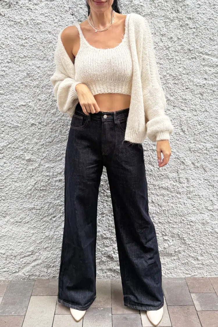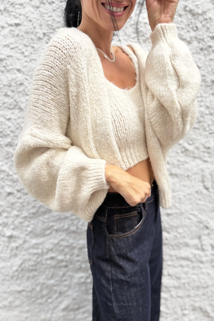 - Το τοπ έχει εφαρμοστή γραμμή και κοντό μήκος, ενώ η ζακέτα έχει μακριά μανίκια και κλασική γραμμή.