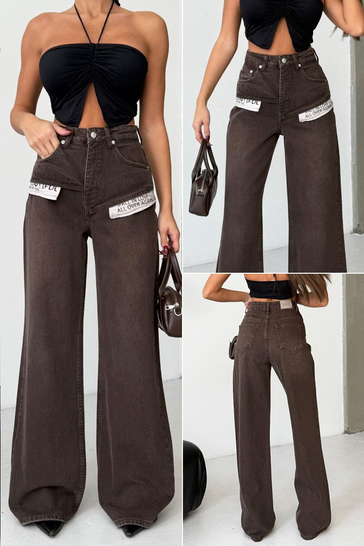 - Το μοντέλο έχει ψηλή μέση, τσέπες, φαρδιά γραμμή, εντυπωσιακές λεπτομέρειες και καφέ σχέδιο.