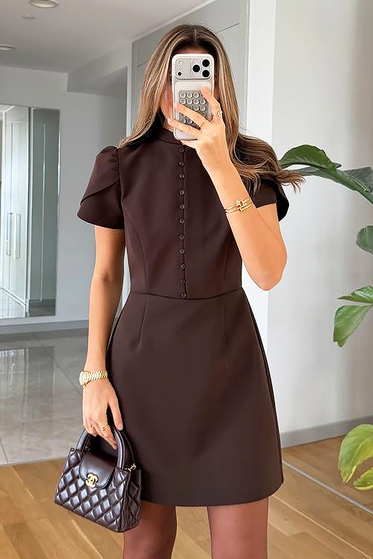 - Το μοντέλο έχει κομψή γραμμή, κουμπιά, γιακά και κοντά φουσκωτά μανίκια.