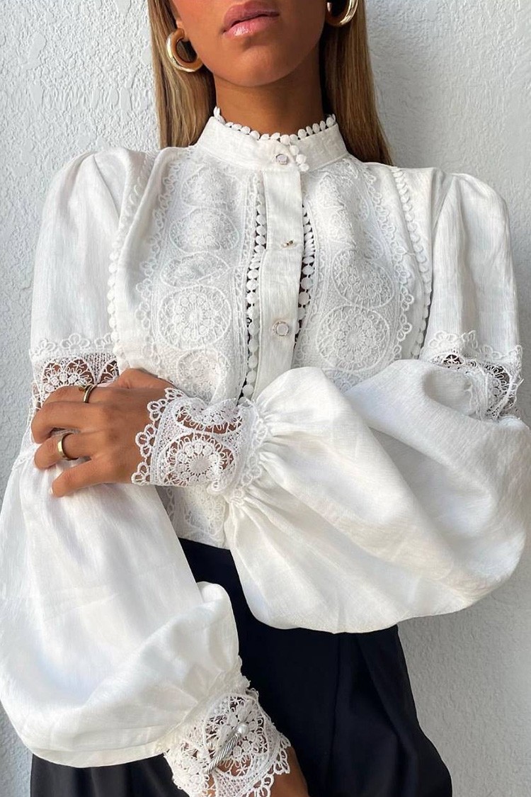 - Το μοντέλο έχει κουμπιά σε όλο το μήκος, μακριά, εντυπωσιακά μανίκια και όμορφη δαντέλα.