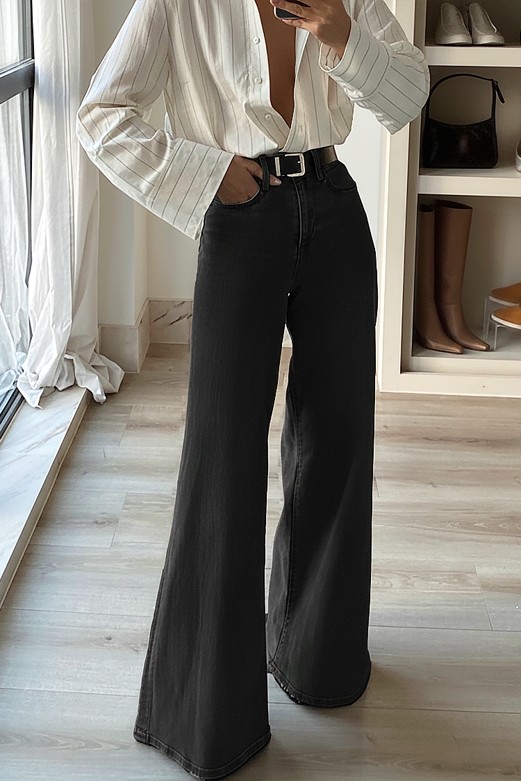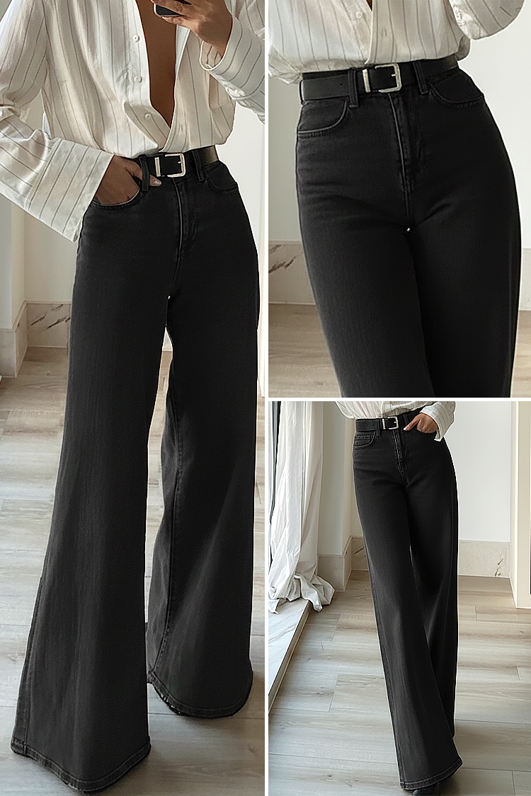 - Το μοντέλο έχει ψηλή μέση και φαρδιά μπατζάκια, είναι μαύρο και έχει ελκυστική ζώνη.