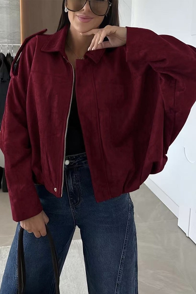 - Το μοντέλο έχει oversize γραμμή, είναι από οικολογικό βελούδο και κλείνει με φερμουάρ στο μπροστινό μέρος.