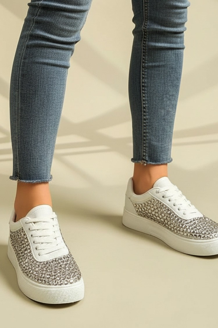 - Για να κινείστε ελεύθερα, επιλέξτε αυτά τα γυναικεία πάνινα παπούτσια με ελκυστικό σχεδιασμό και πέτρες.
