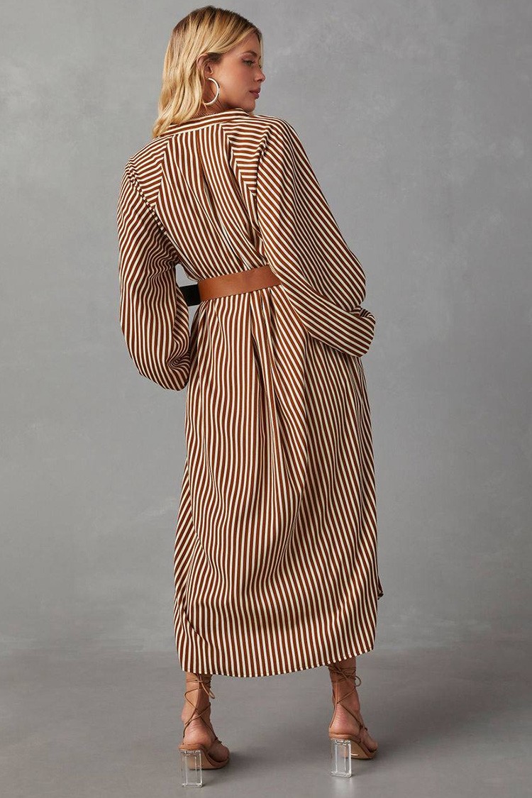 - Για να είστε μοντέρνα, εμπιστευτείτε αυτό το midi φόρεμα με ελκυστικό ριγέ σχέδιο.