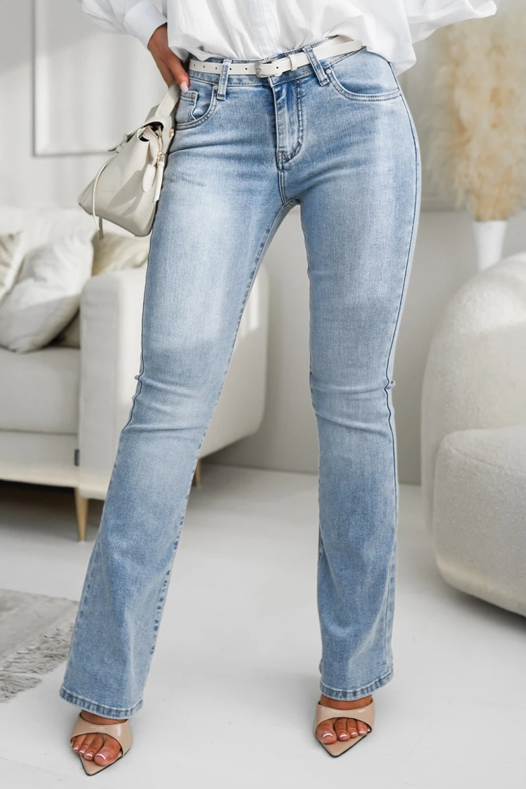 - Το μοντέλο έχει ψηλή μέση και φαρδιά γραμμή, πλαϊνές τσέπες και ανοιχτό μπλε σχέδιο.